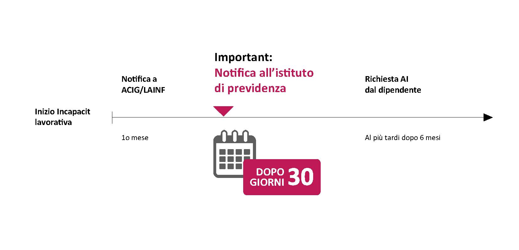 Quanto più tempestiva è la notifica, tanto più efficacemente la persona interessata può essere sostenuta nel ritorno al lavoro (si veda anche il capitolo successivo Reinserimento). Studi dimostrano che sei mesi dopo l’inizio di una malattia la probabilità di tornare al lavoro è inferiore al 50 percento, altri sei mesi più tardi è già sotto il 20 percento.