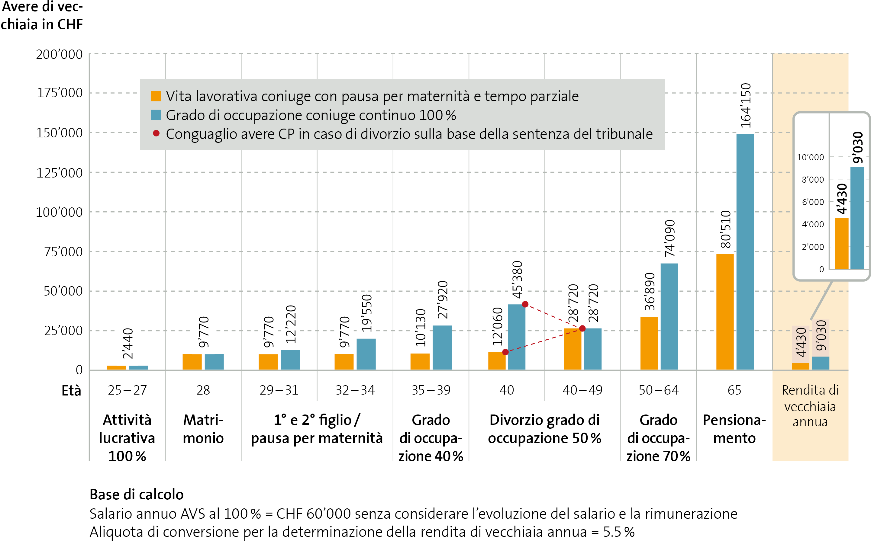Con la pausa maternità, il lavoro a tempo parziale e il divorzio (compensazione dell’avere della cassa pensione), la rendita di vecchiaia annua del secondo pilastro, nell’esempio mostrato, è circa la metà di quella che si otterrebbe con un lavoro a tempo pieno continuativo.