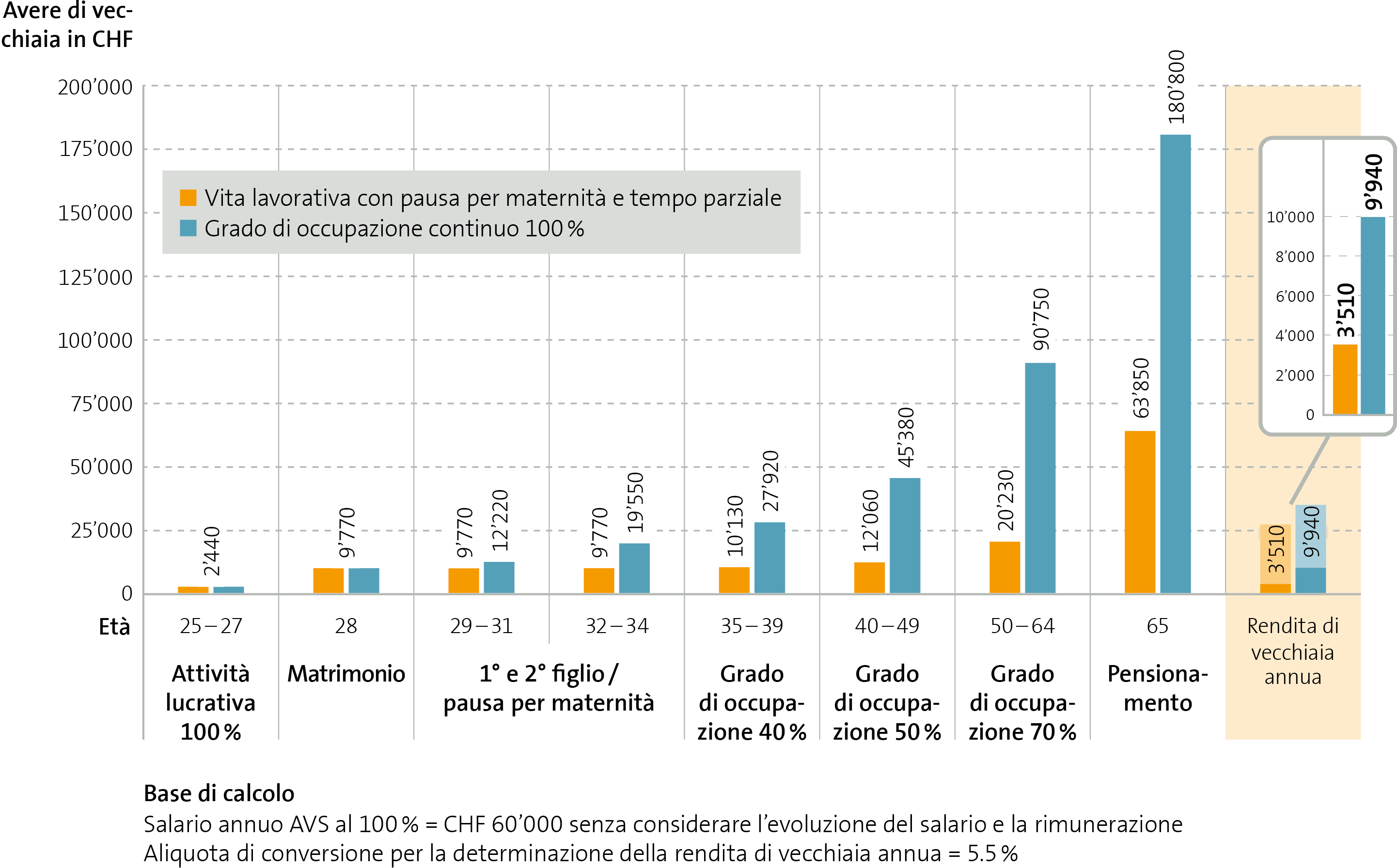 Solo chi svolge un lavoro retribuito può versare i contributi in una cassa pensione per la propria vecchiaia. Se l’attività lavorativa viene interrotta per mesi o anni, in questo periodo mancano non solo il salario, ma anche i contributi alla cassa pensione per la previdenza per la vecchiaia; si creano così lacune previdenziali. Un’interruzione dell’attività lavorativa dovuta a una pausa maternità o al lavoro di cura (ad esempio, assistenza ai genitori anziani) può comportare, al momento del rientro al lavoro, una battuta d’arresto nella carriera e quindi un salario inferiore rispetto a quello precedente. Spesso anche il carico di lavoro è inferiore al momento del reinserimento professionale.