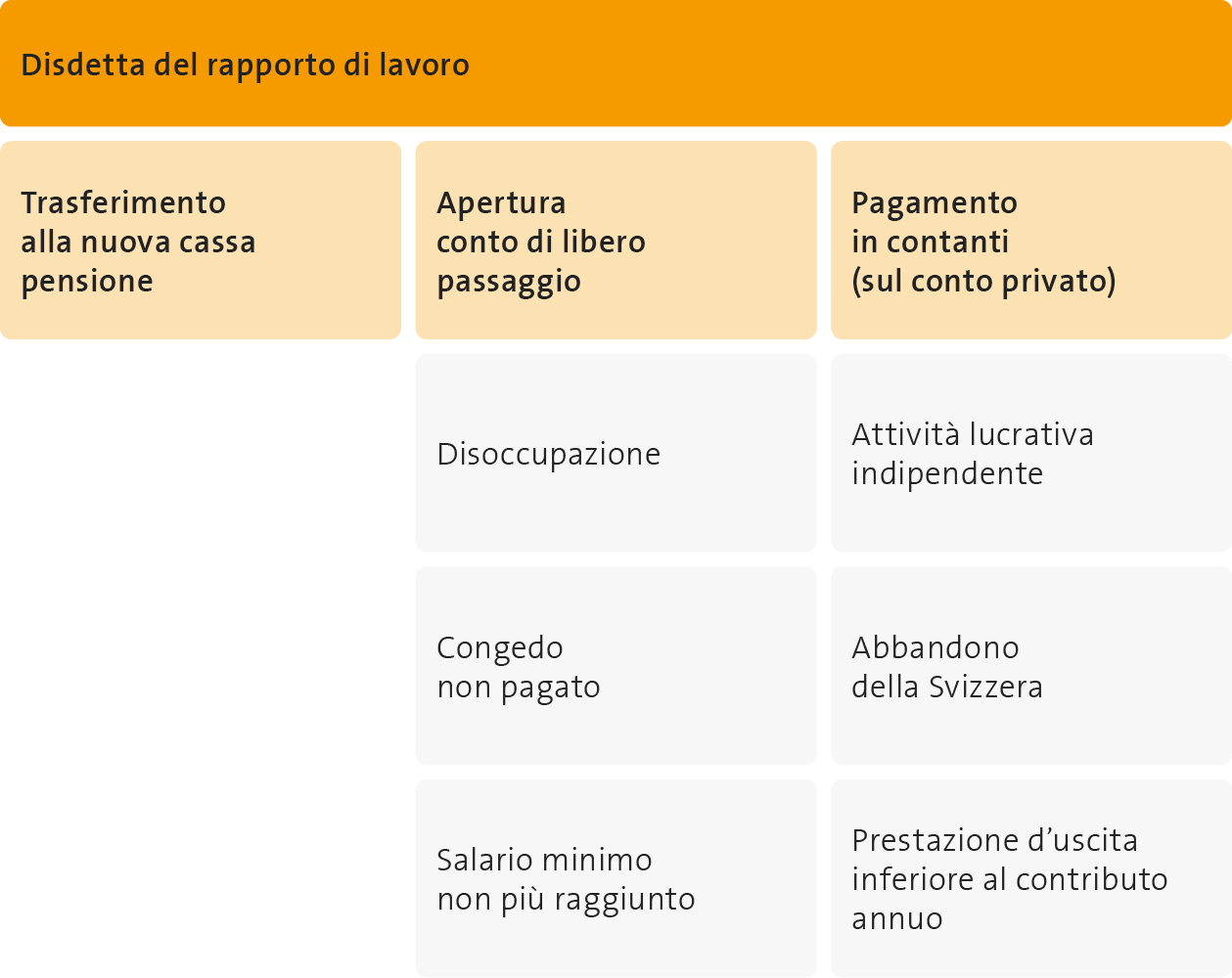 Se non raggiungete più il salario minimo LPP, trasferiremo la prestazione d’uscita su un conto di libero passaggio (conto bloccato) presso una banca di vostra scelta.