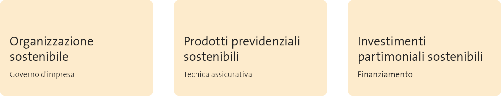 Oltre che nell’ambito dei nostri investimenti patrimoniali, prestiamo attenzione agli aspetti della sostenibilità anche nei nostri prodotti previdenziali e nelle nostre attività aziendali. Suddividiamo la valutazione dei criteri di sostenibilità in base all’impatto sull’ambiente (E = Environmental), sulla società (S = Social) e sul governo d’impresa (G = Governance).
