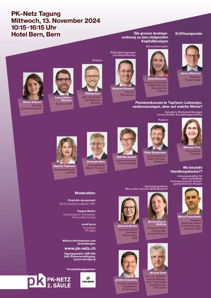 Am 13. November 2024 treffen sich Fachleute aus der Branche an der PK-Netz Tagung in Bern. Nathalie Sesiani, Leiterin Vorsorge bei der Previs, wird zusammen mit drei weiteren Fachpersonen den Umgang mit Leistungsverbesserungen in den Pensionskassen diskutieren.