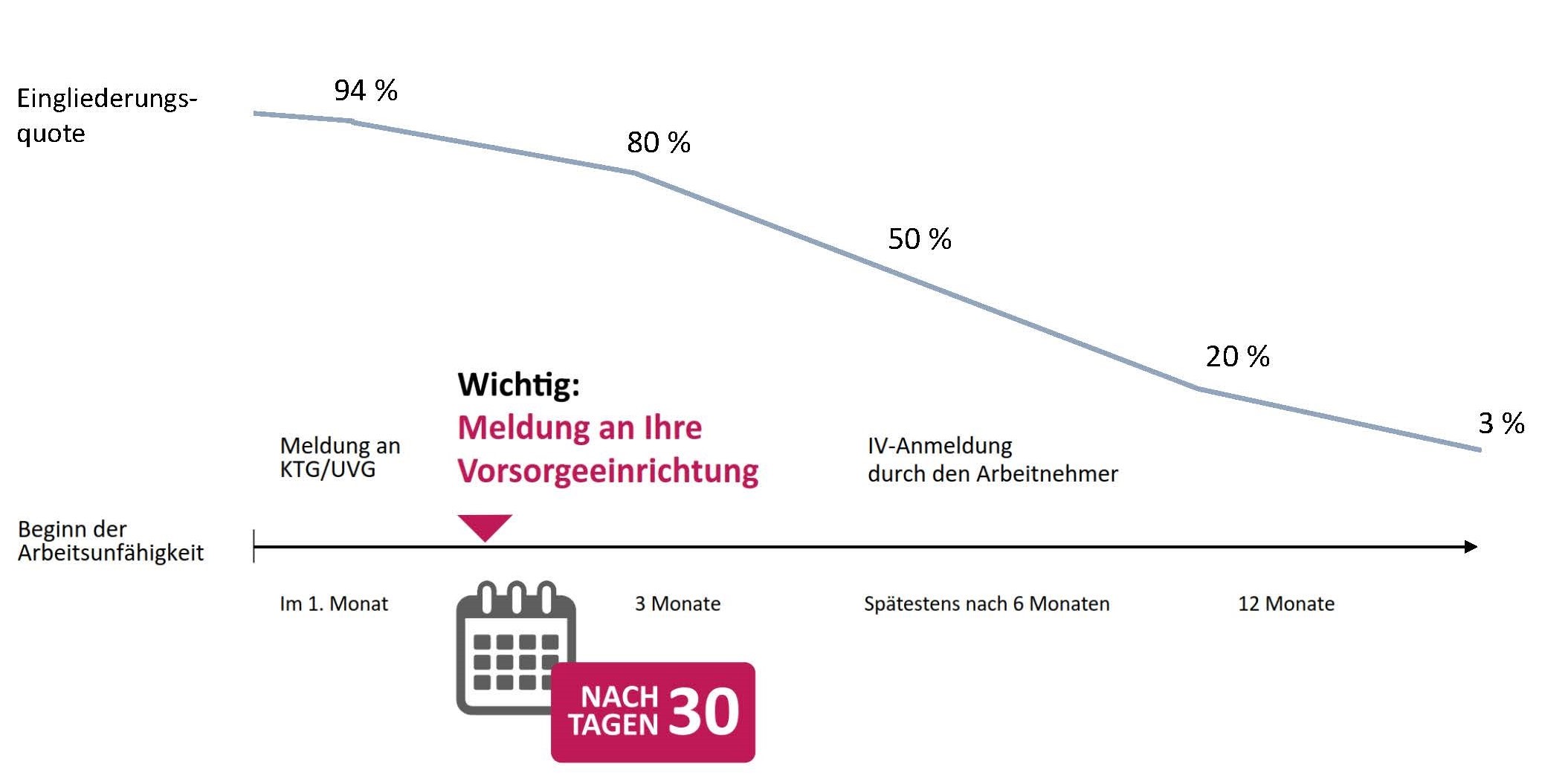 Je früher die Meldung erfolgt, desto wirksamer kann die betroffene Person für ihre Rückkehr an den Arbeitsplatz unterstützt werden (siehe auch nachfolgendes Kapitel Wiedereingliederung). Studien zeigen, dass sechs Monate nach Eintritt einer Krankheit die Wahrscheinlichkeit für die Rückkehr an den Arbeitsplatz unter 50% liegt, ein weiteres halbes Jahr später bereits unter 20%.